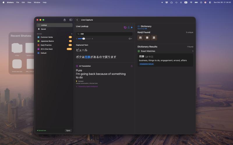 Kiratoru - Japanese Text Recognition & Dictionary Transform your Japanese learning with real-time text recognition and comprehensive dictionary lookups Kiratoru is the ultimate Japanese learning companion that captures and translates Japanese text from any app on your screen. Whether you're reading manga, playing video games, browsing websites, or studying documents, Kiratoru makes Japanese comprehension effortless and engaging.